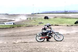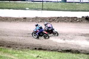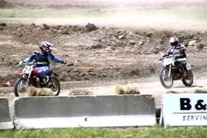 Race 11 was my 100cc class and the Women combined. My Mom has only seen me race about twice in my life and is always real worried. It didn't help one year when she came out to watch me in a demo derby on my 22nd birthday and my car caught on fire and I had to climb out the front window hole. I kidded her that unlike most other guys, I was to turn 46 this coming week and was only riding a bike that is 10 more cc's larger than when I was 12 years old. She was still concerned because racing is racing and stuff happens. Dad remains quiet and probably wonders why he bought me that first cycle when I was 10 years old but he can see the pleasure it brings me and his grandkids. Roger Wellman is killing us in this class with his monoshocked 1978 YZ 100 (79 engine) against our dual shocked 1970 to 1974 Hodaka's. I can beat him to the first corner nearly every moto only to get passed by him later on. Roger is no slouch of a rider either and confessed that he was moving into the Expert Class on his big bike next year. Now if only I can get him on a '74 Yamaha MX 100 with dual shocks in the 100 class :) Moto 1 I got the holeshot and went low in the banked turn. I heard a bike near me and was expecting it to be Roger but it was actually Muck Honeyman on my other chromed tanked Rat. As we went down the long straight Roger blew by us like normal but we kept him within the sight the whole race. Muck and I have known each other since grade school and trust each other on the track. I would go low and he would go high and we would always be side beside side off the fast straight away jump. I would throw a few fake leg kicks at him gladiator style as we were doing about 60 mph and he would do the same to me the next lap. We were laughing out butts off at each other and yelling at each other in the corners. We changed the lead almost every lap and you could have thrown a blanket over us at most times. It was a absolute BLAST in both moto's and rather entertaining to several who told us so. I bested Muck and in Moto 2 Roger lended his YZ to another rider and set out the race. He said he enjoyed the show also. I ended up winning for the day and Muck was second but that is nothing compared to the fun we had on the track racing the little bikes.